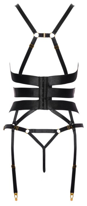 Černý korzet s podvazky a šňůrka bez rozkroku v sadě od Cottelli LINGERIE. Sada má stylový a detailní design s pružnými ramínky v elegantním saténovém vzhledu a zlatými doplňky. Sada je měkká a pružná pro velmi pohodlné nošení. Ramínka podprsenky jsou spojena dalším ramínkem se zapínáním na háček. Ramínka podprsenky, četná ramínka na košíčcích a podvazky lze nastavit pro perfektní padnutí. Šňůrka je svůdně bez rozkroku a zároveň odhaluje i na mnoha dalších místech.