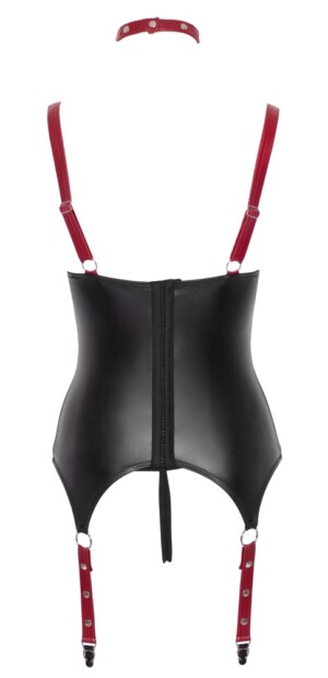 Odhalující baskický a rozkrokový string od Cottelli BONDAGE vyrobený z krásného, pružného matného materiálu s ramínky k podprsence, podvazkovými ramínky a páskem v pase (pouze vpředu) z červeného materiálu s cvočky. Baskický set má košíčky s kosticemi a zapínání na háčky vzadu. Podprsenku a podvazková ramínka lze nastavit pro perfektní nošení. Tanging je bez rozkroku. Součástí setu je límec a pouta v odpovídající červené barvě. Límec má vpředu kroužek, který lze nastavit pomocí druků. Jednoduchá pouta lze stylově nosit na zápěstí, takže ruce jsou svázané vpředu nebo vzadu na těle.
