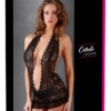 Babydoll, choker a manžety na ruku v sadě od Cottelli BONDAGE PLUS. Krátká a rozšířená babydoll z jemné fialové strečové květinové krajky s černou dvouvrstvou sukní z elastické jemné síťoviny powernet. Černé matné detaily a stříbrné doplňky s kroužky a řetízky zdůrazňují okouzlující hravý vzhled. V hlubokém výstřihu drží vše pohromadě dva ozdobné kroužkové ramínka. V hlubokém výstřihu na zadní straně je také spojovací strečový pásek. Pro vášnivé bondage lze měkké manžety na ruce s karabinkami zaháčkovat do kroužků pevného pásu pod prsa. Manžety jsou nastavitelné suchým zipem. Úzký choker s kroužkem vpředu a nastavitelným suchým zipem vzadu na krku dotváří bondage styl.