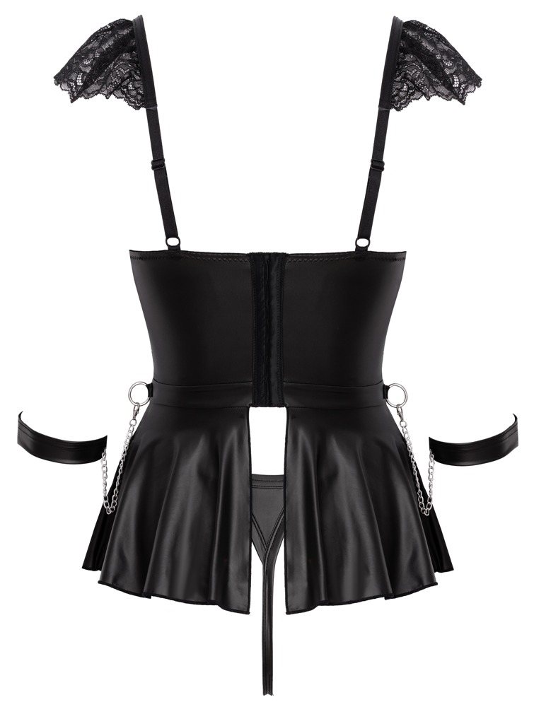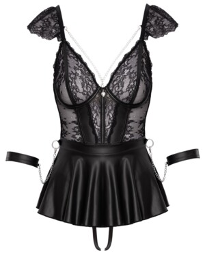 Vzrušující černá sada od Cottelli BONDAGE obsahuje košilku, šňůrku bez rozkroku a měkká pouta. Sada je vyrobena ze stylové směsi jemné krajky a cool matného materiálu se stříbrnými doplňky. Je také měkká a pružná pro maximální pohodlí. Košilka má odnímatelné řetízky a přívěsek ve tvaru srdce mezi košíčky s kosticemi. S nastavitelnými ramínky s jemnými krajkovými volánky. Nastavitelné zapínání na háčky vzadu. Rozšířená část sukně s matným vzhledem má kroužky na obou stranách pasu. Součástí sady jsou pouta, která lze připevnit k kroužkům pomocí karabinek. Měkká pouta lze rychle nasadit a upravit díky suchým zipům. Šňůrka má svůdně otevřenou oblast v rozkroku, která dotváří fantazijní bondage vzhled.