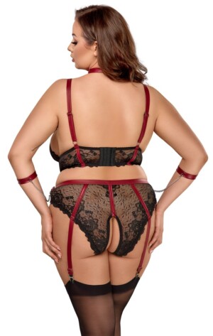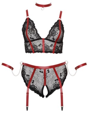 Dlouhá podprsenka, tanga bez rozkroku, límec a 2 manžety na ruce v sadě od Cottelli BONDAGE PLUS. Jemná černá strečová krajka je propracovaně zdobena kontrastními detaily v červeném matném vzhledu a stříbrnými doplňky. Krásná dlouhá podprsenka s měkkými košíčky a nastavitelným zapínáním na háčky vzadu. Ramínka jsou také nastavitelná, stejně jako šle na tangách. Tanga jsou v rozkroku otevřená. Na boku pasu je kroužek, do kterého lze snadno zavěsit přiložené manžety na ruce pomocí karabinek. Měkké manžety jsou nastavitelné pomocí suchého zipu. Úzký límec s předním kroužkem a nastavitelným suchým zipem dotváří podmanivý vzhled.