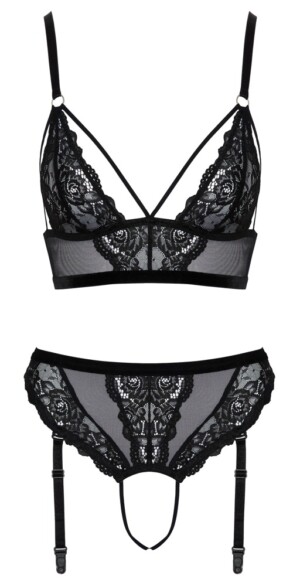 Sada podprsenky Bralette a tang bez rozkroku od Cottelli LINGERIE v jemné kombinaci černé krajky a síťoviny Powernet. Měkká a pružná po celém obvodu pro vysoké pohodlí. Delší podprsenka zaujme svými strečovými ramínky ve výstřihu a tanga do pasu zcela otevřeným rozkrokem. Ramínka jsou nastavitelná, stejně jako šle, které lze z tang zcela odejmout.