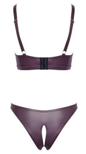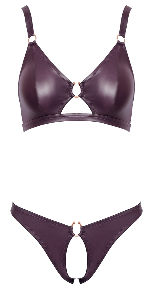 Sada podprsenky a kalhotek bez kostic od Cottelli LINGERIE. Podprsenka a kalhotky jsou vyrobeny z fialového wet looku – měkkého a pružného pro pohodlné nošení. Má elegantní design s krásnými prsteny v barvě růžového zlata. Vzadu podprsenka má háček pro nastavení. Ramínka lze také upravit. Svůdné kalhotky jsou bez rozkroku.