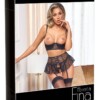 Dlouhá podprsenka, podvazkový pás a šňůrka bez rozkroku jsou zkombinovány do elegantní a erotické sady od Cottelli LINGERIE. Vše je vyrobeno z měkké, jemné a pružné černé krajky. Má také sametová ramínka a stříbrné kroužky. Delší podprsenka s policemi má košíčky s kosticemi, které jsou mírně vyztužené. V jinak otevřené oblasti dekoltu je také odnímatelný řetízek s kamínky. Zapínání na háček vzadu a sametová ramínka jsou nastavitelná. Široký podvazkový pás má také nastavitelné zapínání na háček vzadu. 6 sametových podvazkových ramínek je také nastavitelných. Malá šňůrka je svůdně bez rozkroku.