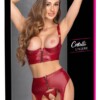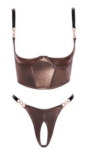 Luxusní sada bez rozkroku od Abierta Fina se skládá z podprsenky s poličkou a tang. Sada je vyrobena ze stylového a třpytivého bronzově zlatého materiálu s černými detaily a elegantními růžovo-zlatými prvky. Sada je měkká a pružná. Dlouhá podprsenka s poličkou má tvarující kostice vpředu a lehce vyztužené košíčky s kosticemi pro perfektní střih. Mezi košíčky je malý ozdobný přívěsek ve tvaru srdce. Na přední straně každého ramínka podprsenky je také krásný detail. Ramínka podprsenky jsou nastavitelná. Vzadu je nastavitelné zapínání na háček. Tanga jsou také mimořádně svůdná, protože nemají rozkrok a díky ozdobným detailům na přední straně elastického pasu.