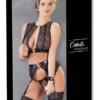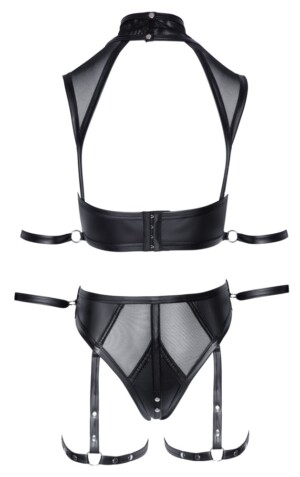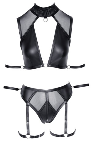Top a kalhotky od Cottelli BONDAGE vyrobené z krásného matného materiálu s průhlednými vsadkami Powernet. Top s velmi nízkým výstřihem a vysokým límcem, který má vpředu ozdobný kroužek a vzadu 2 druky pro zapínání. Je téměř bez zad, ale má široký pruh materiálu se zapínáním na suchý zip. Po obou stranách je kroužek s poutkem na ruce. Kalhotky jsou do pasu a v rozkroku mají druky pro erotické chvíle rozkoše. Po obou stranách (v pase) je kroužek s poutkem na ruce. Stehenní popruhy lze odejmout. Poutkem na paže a ruce je zapínání na suchý zip a lze je také odejmout.