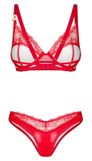 Sada Aliosa od Obsessive obsahuje podprsenku s kosticemi a tanga. Sada je ve svůdném stylu a smyslné červené barvě – je vyrobena z krásného lesklého, hladkého materiálu a jemné, průhledné květinové krajky. Je také měkká a pružná pro velmi pohodlné nošení. Mezi košíčky s kosticemi a na jednom z ramínek podprsenky je decentní ozdobný zlatý detail. Ramínka a zapínání na háček vzadu lze nastavit.