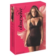 Trojdílná černá sada Donarella od Obsessive obsahuje košilku, tangá a náhrdelník. Košilka je vyrobena z jemného, pružného tylu a na košíčcích a lemu je propracovaná výšivka. Je měkká a pružná pro pohodlné nošení. Přiléhavá košilka má nízký střih a košíčky s kosticemi. Malý ozdobný prvek mezi košíčky je skutečným poutavým prvkem. Vzadu se zapíná na háček a ramínka lze nastavit dle potřeby. Krásné a klasické tangá a přiléhavý, ale nastavitelný náhrdelník s výšivkou dotvářejí erotický a elegantní vzhled!