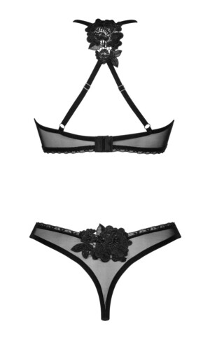 Měkká podprsenka a tanga v černém a průhledném setu Latinesa od Obsessive. Měkký strečový tyl s částečně neprůhlednými částmi. Podprsenka s ozdobným prvkem mezi měkkými košíčky. Nastavitelná křížená ramínka vzadu jsou zdobena propracovanou výšivkou. Zapínání na suchý zip lze upravit dle potřeby. Tanga svádějí také elegantní výšivkou přes zadeček.