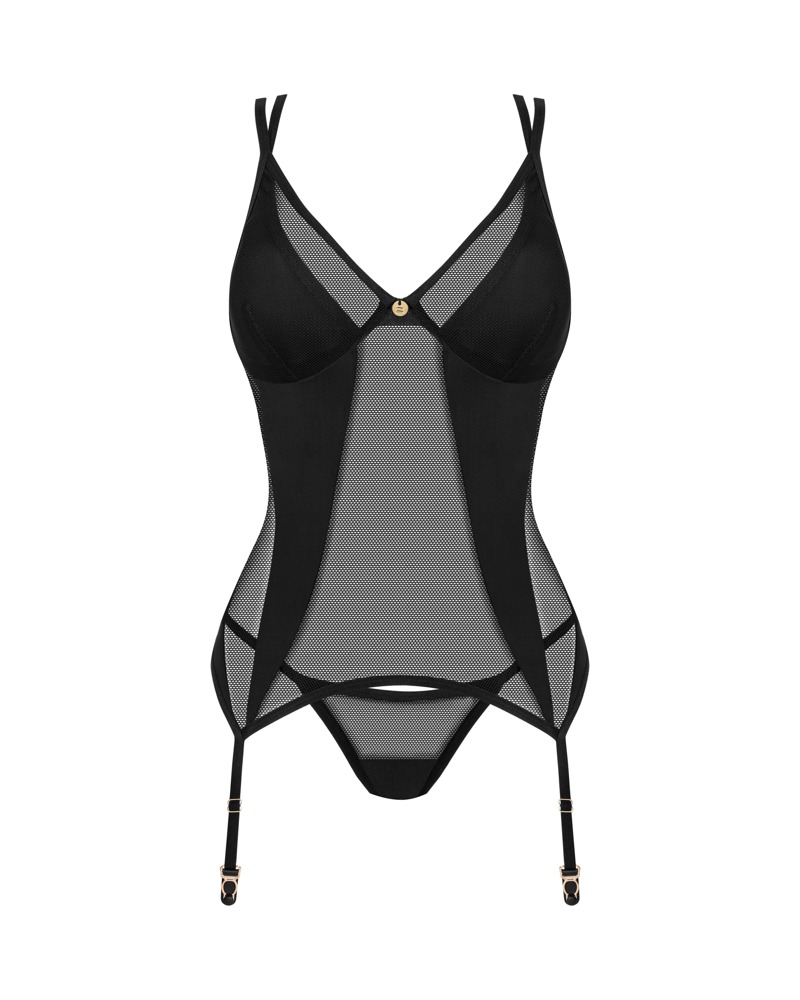 Podvazkový top a tanga v černém setu Nesari od Obsessive. Měkká elastická síťovina ve stylové kombinaci s neprůhledným strečovým materiálem. Malý šperk mezi košíčky s kosticemi. S nastavitelným suchým zipem v dolní části zad. Sofistikovaná zkřížená dvojitá ramínka a podvazková ramínka lze také upravit dle potřeby. Síťovaná tanga jsou v rozkroku neprůhledná.