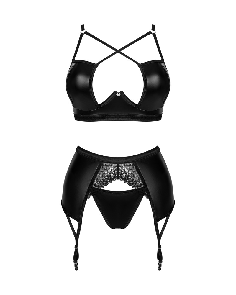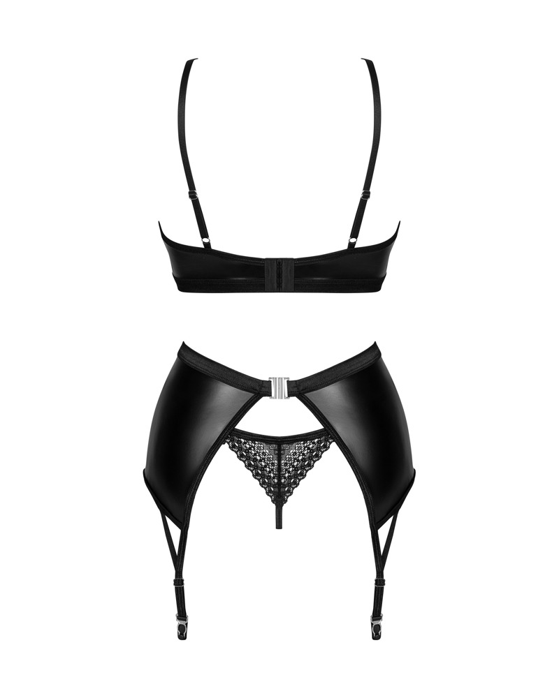 Trojdílná sada Norides od Obsessive s podprsenkou s kosticemi, podvazkovým pásem a tangami ve wet looku, který je elastický a měkký na dotek. Podprsenka s kosticemi v sofistikovaném stylu s ramínky a extravagantním výstřihem. Ramínka lze nastavit – stejně jako zapínání na suchý zip vzadu. Podvazkový pás má krajkovou vsadku vpředu a zapínání na suchý zip vzadu. Ramínka lze nastavit. Tanga s wet lookem svádějí malým krajkovým trojúhelníkem na hýždě.