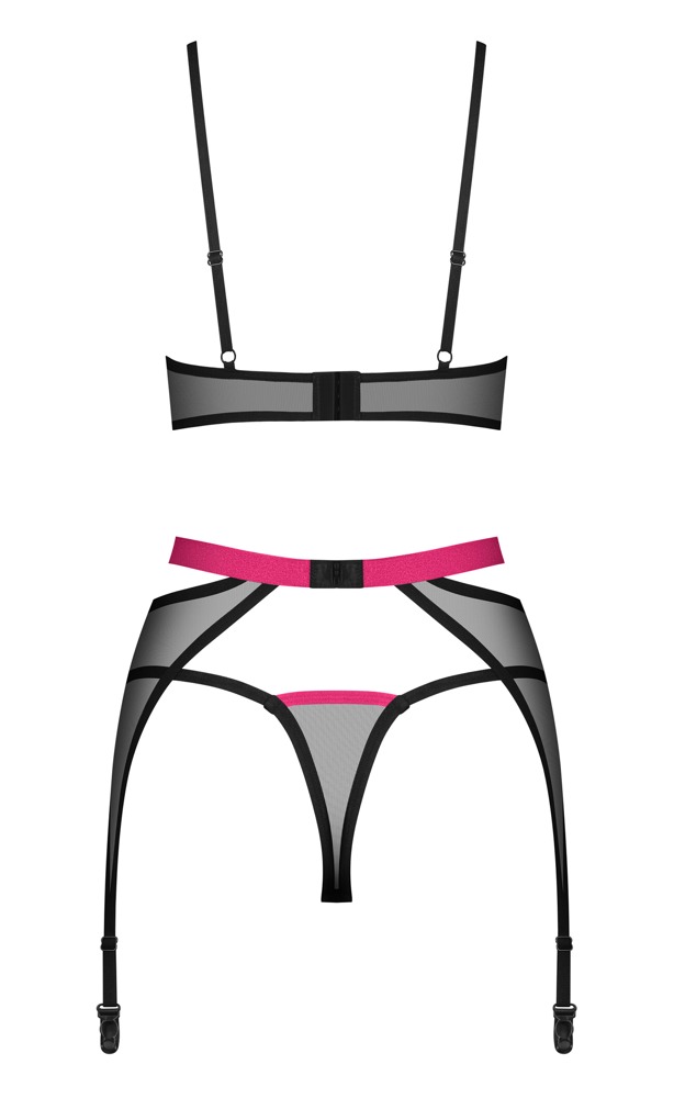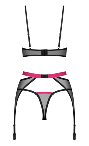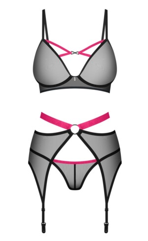 Trojdílná sada podvazků Novenes od Obsessive obsahuje podprsenku bez kostic, podvazkový pás a tangá. Vše je vyrobeno z jemné černé síťoviny Powernet s růžovými ramínky. Podprsenka má ramínka přes dekolt a krásný kamínkový prvek mezi košíčky bez kostic. Podprsenka má ramínka, která lze nastavit, a také zapínání na suchý zip vzadu. Krásný podvazkový pás je mimořádně svůdný díky kontrastnímu pasu a kroužku vpředu. Vzadu je suchý zip pro jeho nastavení. Ramínka podvazků lze také nastavit. Sladěné tangá dotvářejí toto elegantní, průhledné trio.