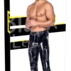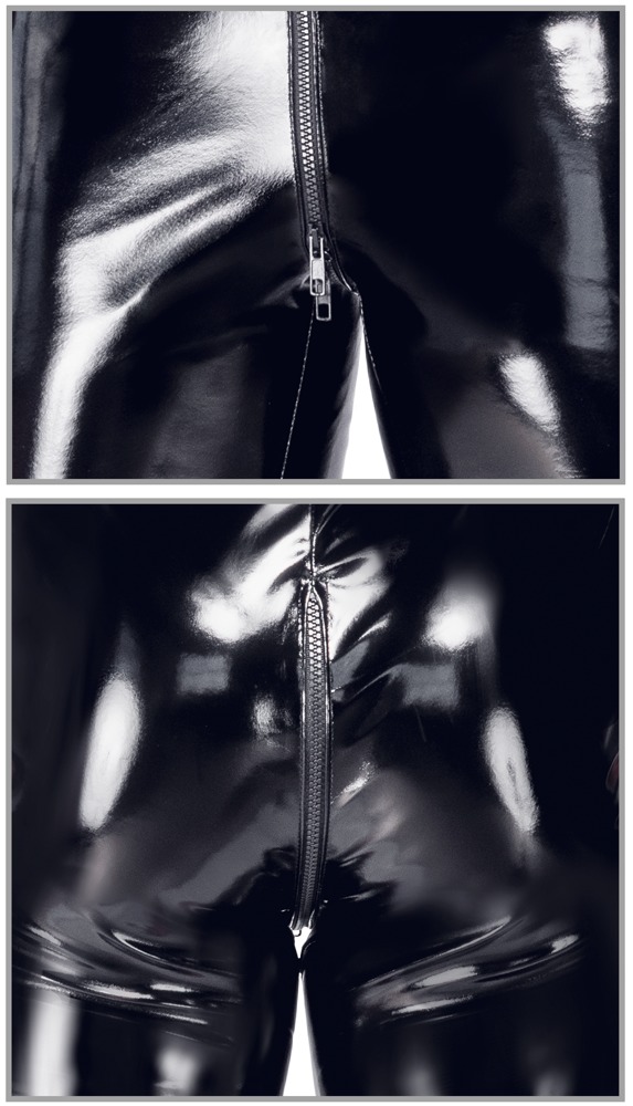 Lesklý černý vinylový overal od Black Level má krátké rukávy a nohavice. Je mírně pružný pro přiléhavý, ale pohodlný střih. Má také polstrovaný třícestný zip, který začíná u výrazného stojáčku, vede přes rozkrok a končí v horní části hýždí.