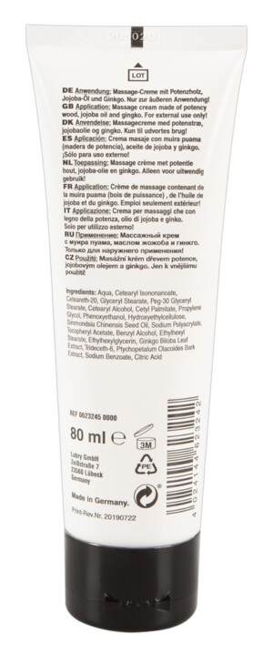 Krém na penis, který se vmasíruje do penisu pro podporu krevního oběhu. S extrakty z potentního dřeva, jojobového oleje a ginkga. Vhodný pro každodenní použití. 80 ml.