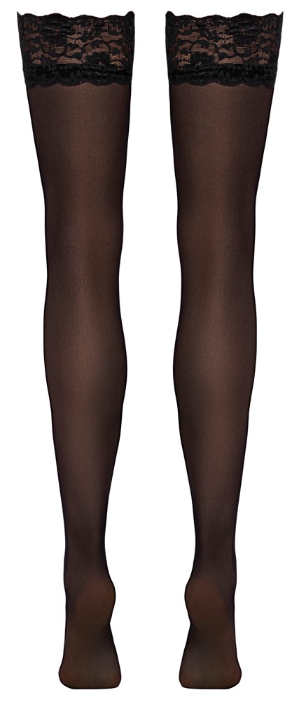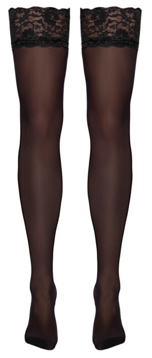 Sametově měkké černé punčochy od Cottelli LEGWARE mají nahoře pružnou 9 cm širokou krajku. 20 denier. Certifikace Oeko-Tex.