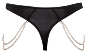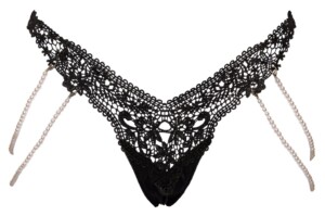 Šňůrka od Cottelli LINGERIE je vyrobena z luxusní vyšívané krajky (vpředu) a pružného materiálu pro perfektní padnutí. Na obou stranách jsou dva pružné perlové řetízky. Lze je sundat díky malým karabinkám.