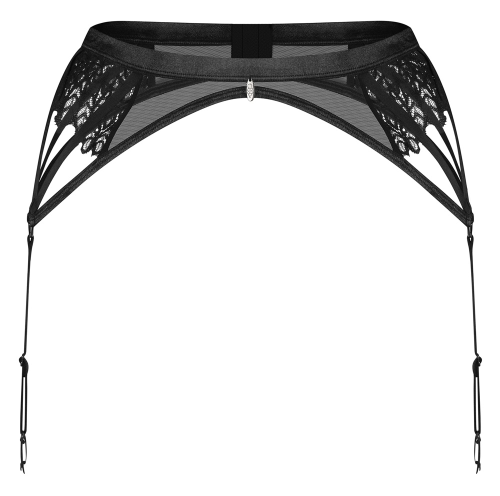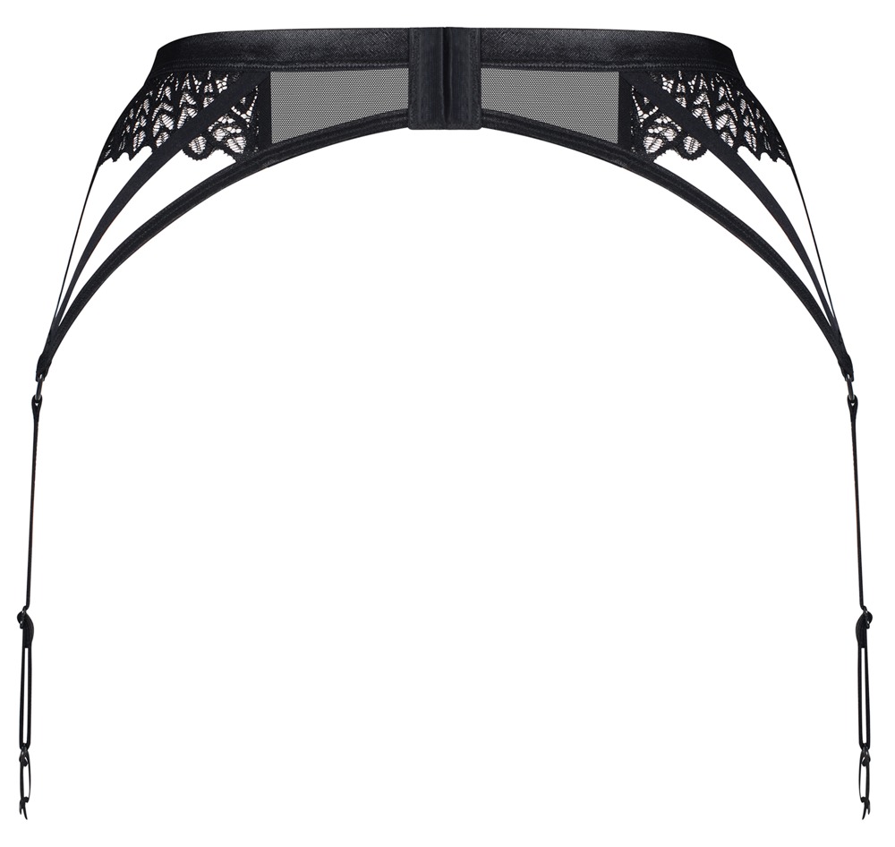 Průhledný černý podvazkový pásek Donarella od Obsessive má po obou stranách propracovanou výšivku. Je měkký a pružný pro velmi pohodlné nošení. 4 pružné pásky se spojují a vytvářejí jeden nastavitelný podvazkový pásek na obou stranách. Vzadu je zapínání na háček. V přední části pasu je malý ozdobný prvek.