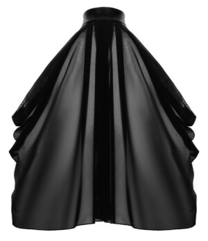 Jemný, černý, průhledný materiál! Široký a volný top Orgia od Noir, který je celý vyroben z jemného, černého, průhledného tylu. V plášťovém stylu s odhalenými rameny a chokerovým výstřihem z materiálu powerwetlook. Vpředu na výstřihu jsou druky. Asymetrický střih: krátký vpředu a otevřený, rukávy a záda jsou zakryté.