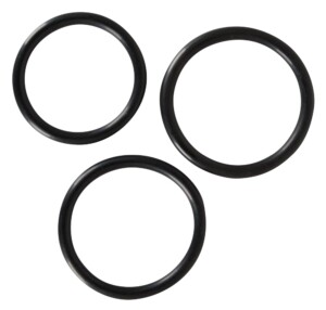 Postroj z imitace kůže s třemi kroužky o různých průměrech: 4, 4,5 a 5 cm. Fialová/černá. Maximální obvod: boky 134 cm, noha 82 cm.