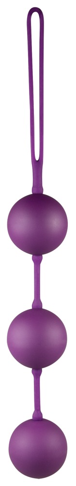 Fialové trio kuliček lásky s vibrujícími vnitřními kuličkami a zatahovací smyčkou. Celková délka 17 cm, průměr kuličky 3,5 cm. Hmotnost 80 g. Silikon, ABS, PU.