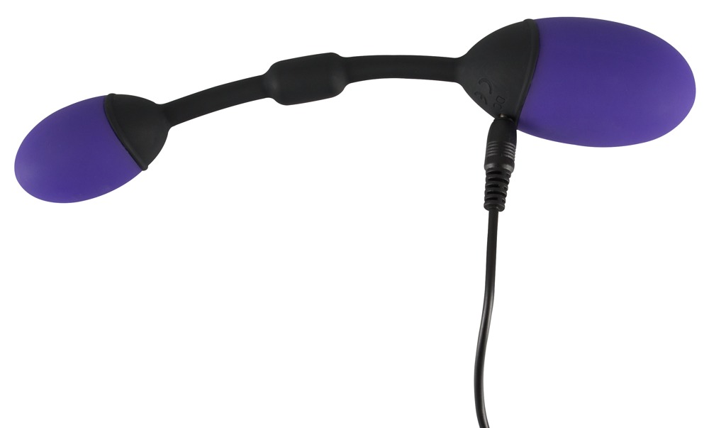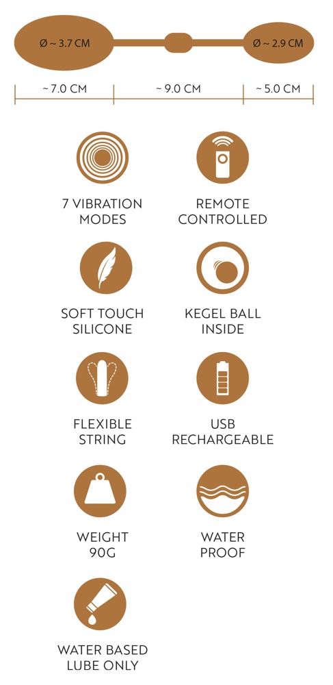 Vibrační koule Love balls od GoGasm pro anus a vagínu, spojené flexibilní silikonovou tyčinkou. Větší kulička vibruje, zatímco uvnitř menší kuličky je smyslná volně se pohybující váha. Větší kulička se zavádí do vagíny a menší do anu – žádný volný popruh se neroztáhne. 7 vibračních režimů lze ovládat dálkovým ovladačem, který má také tlačítkový zámek. Lze nosit diskrétně při každodenních aktivitách. Voděodolné. Součástí balení je nabíjecí kabel USB a baterie pro dálkové ovládání (1 x 23A).