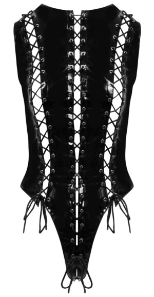 Extravagantní body od Black Level kompletně z černého vinylu. Přiléhavé a přiléhavé ke krku s vysokými výstřihy na nohavicích. Přední díl má 3 volné tkaničky, které lze individuálně nastavit. Centrální šněrování vede rozkrokem až nad spodní část. Zapínání na zip vzadu a zapínání na druky vzadu u krku.