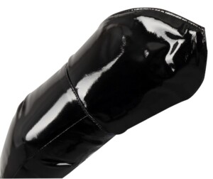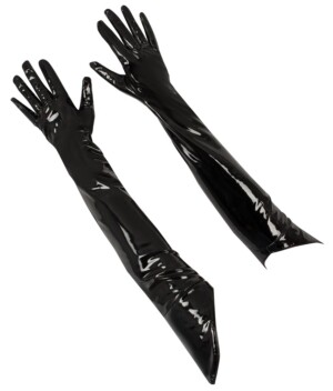 Velmi dlouhé rukavice od Black Level jsou vyrobeny z lesklého černého vinylového materiálu. Sahají téměř k ramenům a průramky se zužují pro pohodlné nošení.