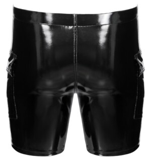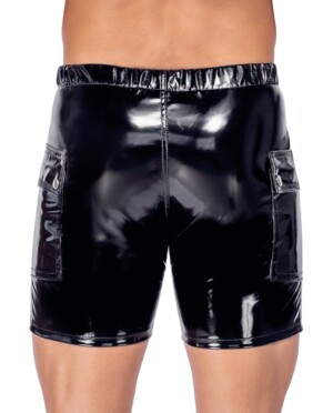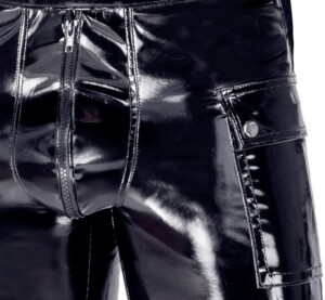 Lesklé černé a mírně pružné vinylové kraťasy od Black Level mají polstrovaný zip na kapse. Po obou stranách kraťasů je klopová kapsa. Kapsy mají stříbrné druky. Jsou volné a pohodlné – v zadní části pasu je pružná guma pro perfektní a pohodlné nošení.